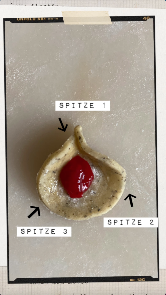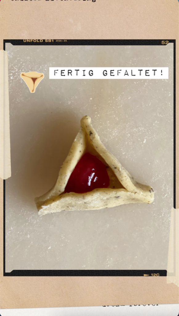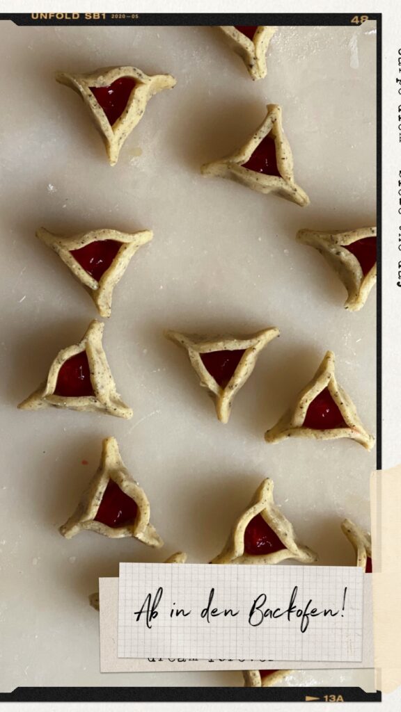 Bitte kühlt die geformten Hamantaschen erst vor dem Backen durch, ansonsten öffnen sie sich. Und unbedingt den Ofen richtig vorheizen! Hätte ich die Rezepte vorher besser gelesen, wäre mir ein Durchgang erspart geblieben 😉