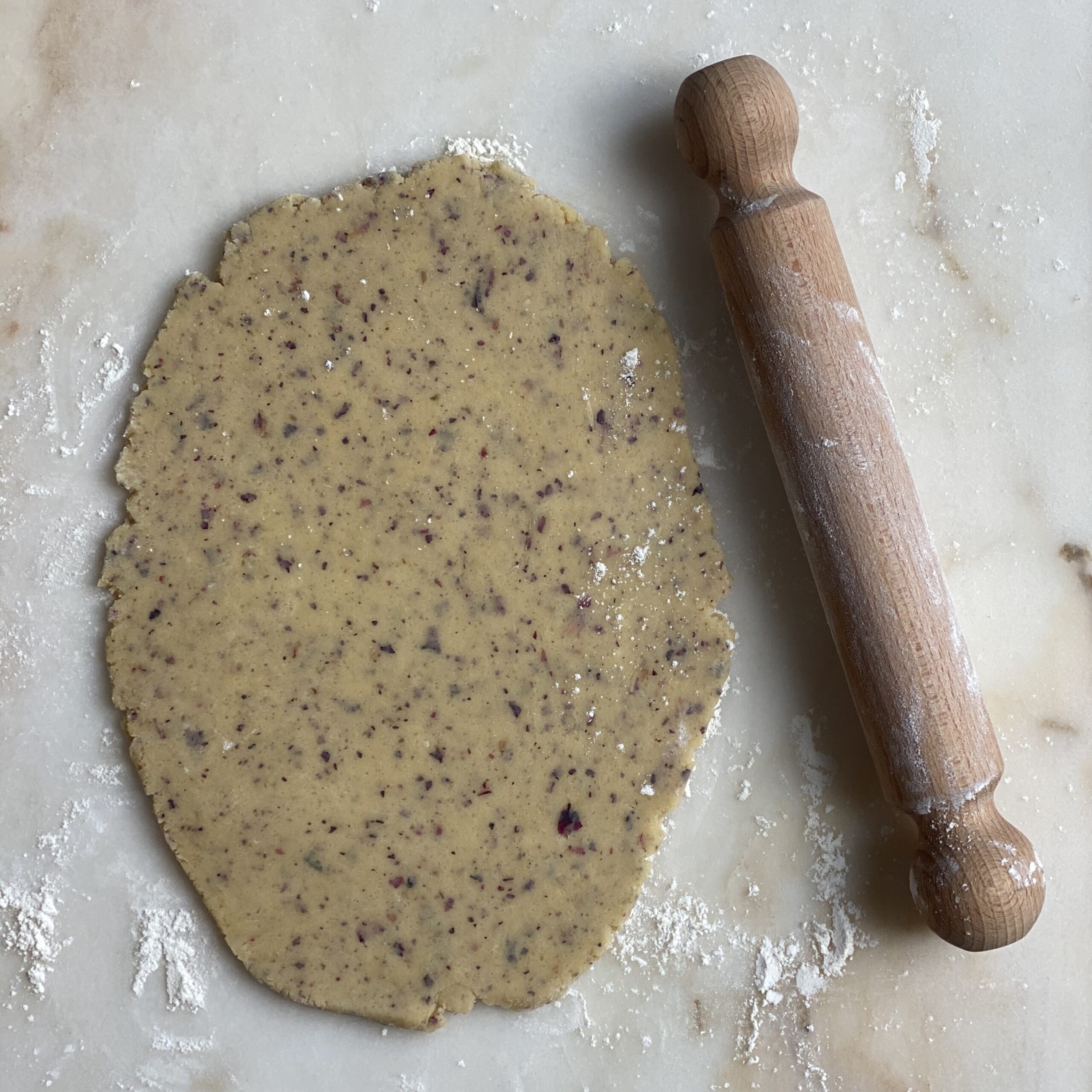 Getrocknete Rosenblüten kann man tatsächlich als Tee kaufen – wer hätte das gedacht 😍 Den gibt es in der Apotheke oder bei Feinkosthändlern. Die Rosenblüten mahle ich dann einfach etwas klein. Das kann man im Mörser, in einem kleinen Mixer oder mit einem Messer machen. Die Größe könnt Ihr selbst bestimmen, man sollte aber darauf achten nicht zu große, dicke Stücke zu verwenden. Das macht es später schwer, den Teig auszustechen oder zu schneiden.